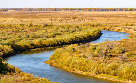 Autumn landscape, yellow trees, dead grass, blue river. Sunny autumn day.