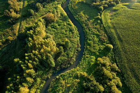 River in the wild. Aerial view of small river in middle of green forest in the wildlife. Natural Resource and Ecosystem. Wildlife Refuge Wetland Restoration. European Green Nature Scenery.