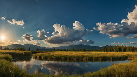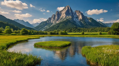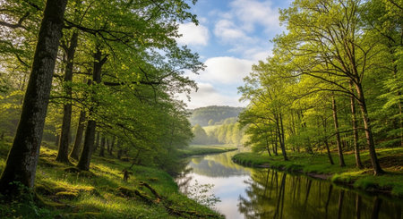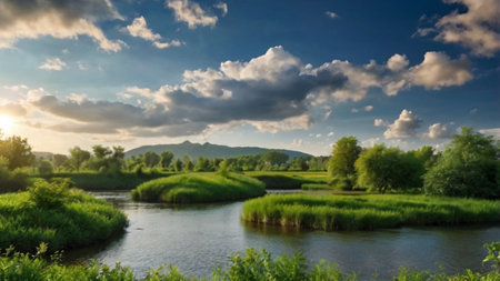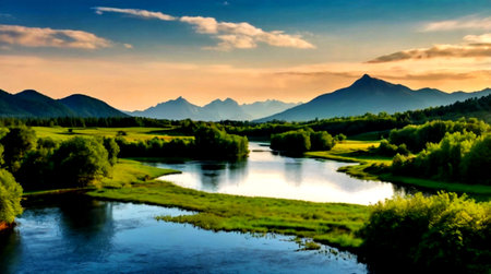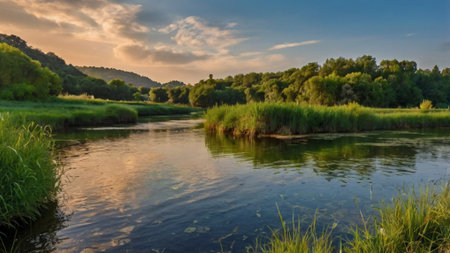 AI Generated. Tranquil River Flowing Through Scenic Landscape