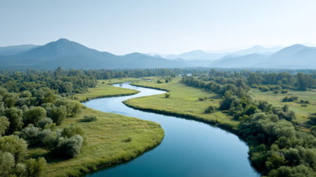 Breathtaking aerial view capturing a pristine river meandering through a vibrant green valley, surrounded by lush vegetation and majestic mountains under a sunny sky