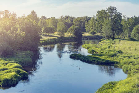 Summer view of the river at sunset time.