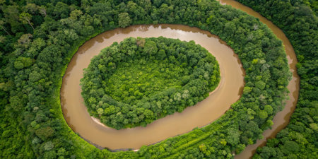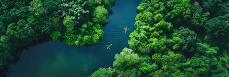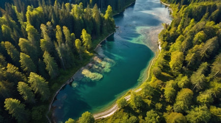 aerial view of pristine river flowing through forest, created with generative ai