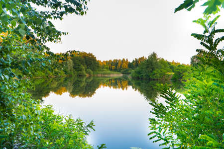 Summer landscape trees reflected in the mirror of the river lit by sunset rays of the sun
