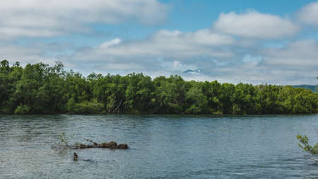 A calm blue river. There are thickets of green forest on the shore. Azure sky. Through the gaps in the clouds, the top of a snow-covered volcano is visible. Kamchatka