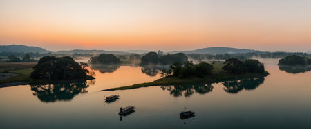 Panorama of a lake in the early morning with fog and boat