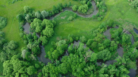Aerial view of winding river and forest. Summer landscape, top view. A green valley with a winding riverbed