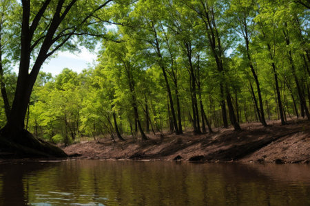 the estuary, surrounded by a mix of deciduous trees and towering firs, stands serene on a rainy day, its tranquil atmosphere reflected in the calm waters, with the misty tops of the trees peeking out from the veil of fog, creating a mystical landscape. ai generated