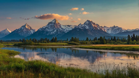 River surrounded by Trees and Mountains in American Landscape. Snake River, Oxbow Bend. Spring Season. Grand Teton National Park. Wyoming, United States. Nature Background Panorama. Sunset Sky