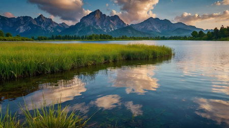 Beautiful summer landscape with mountain lake and blue sky with clouds.
