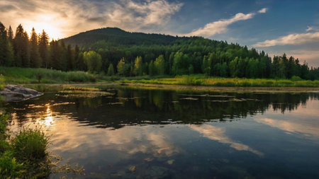 beautiful summer landscape with river and forest on the shore at sunset