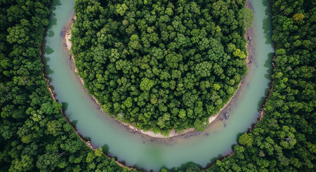 A curved waterway means amid dense foliage, revealing a vibrant, tranquil scene of untouched nature and rich greenery.