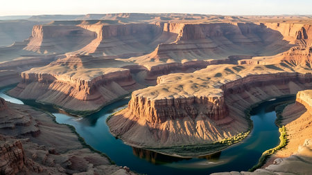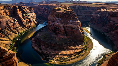 AI Generated. Aerial View of a River Winding Through a Canyon with Layered Rock Formations