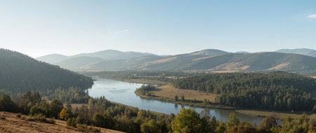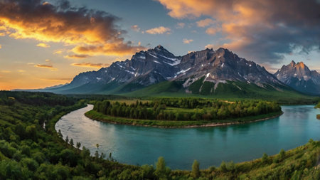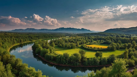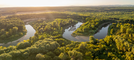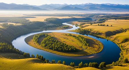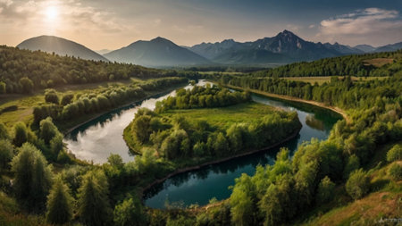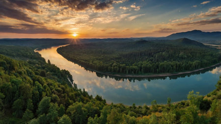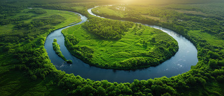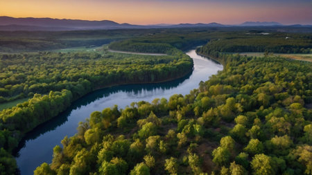 A aerial perspective reveals a serpentine river gracefully winding its way through a vibrant landscape of lush green forests and sun-drenched meadows. The golden light of sunrise bathes the scene, highlighting the rich textures of the vegetation and the tranquil surface of the water. The river's curves create a pattern, emphasizing the natural beauty and untouched of the environment. evokes a sense of peace and serenity, showcasing the harmonious interplay between water, forest, and open...