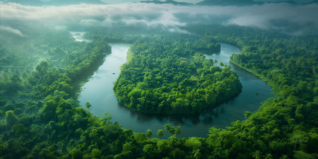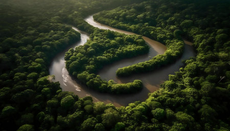 Aerial view of a meandering river through a dense rainforest. Lush green canopy and stunning natural beauty.