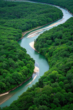 An aerial perspective reveals a winding river carving its path through a vast, dense green forest. The river's curves and meanders create a natural, organic pattern against the uniform texture of the tree canopy. Sunlight dapples through the leaves, highlighting the lushness of the vegetation. This serene and picturesque landscape showcases the untouched beauty of nature, evoking a sense of peace and tranquility. The scene is a testament to the intricate beauty of the natural