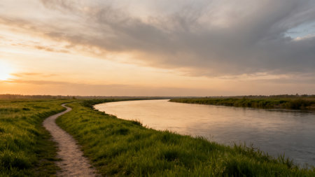 Scenic River Bend Landscape at Sunrise with Wildflowers