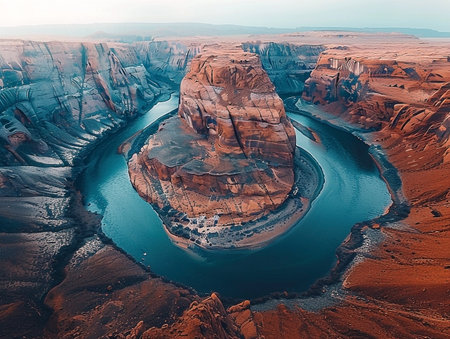This stunning aerial view captures the iconic Horseshoe Bend, showcasing its unique rock formations and the winding river that flows through. The bright sky enhances the serene landscape, perfect for travel and nature enthusiasts.