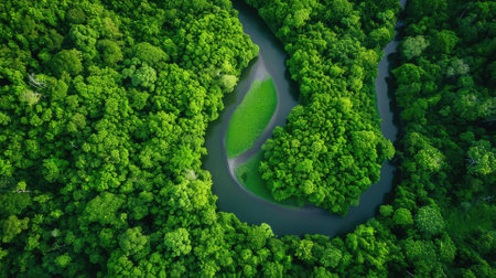 Overhead shot of a winding river cutting through a dense, vibrant green forest, highlighting natures intricate patterns. aerial view. Resplendent.