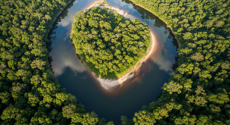 aerial shot of a heart shaped island with lush trees surrounded by a river in a green forest canopy