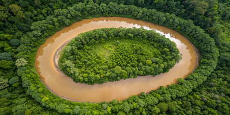 A striking top-down aerial view captures a horseshoe-shaped river bend embraced by the dense, vibrant green canopy of a pristine rainforest.