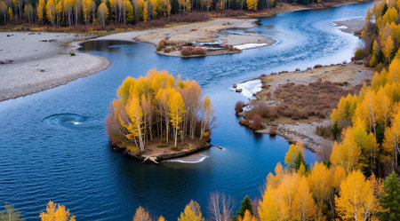 aerial photo of a winding road in autumn, embraced by a vibrant fusion of water and land. inspired by the dusseldorf school of photography, this captivating image showcases bold colors and romantic riverscapes. caras ionut's artistic touch brings forth lively hues, combining shades of green and amber. ai generated