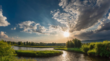 A breathtaking view of a winding river at sunset, showcasing vibrant colors and lush greenery, creating a peaceful atmosphere in the natural landscape.