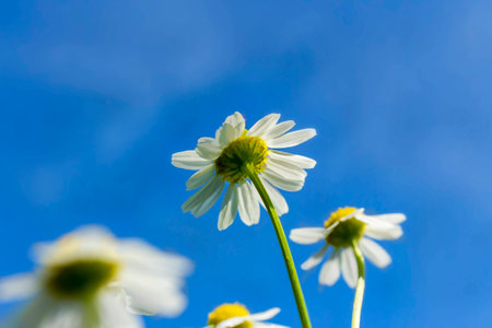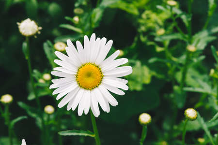Delicate, bright chamomile flowers in a meadow under the sun. Selective focus.