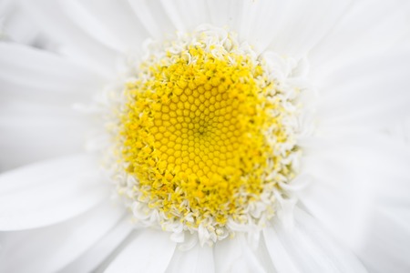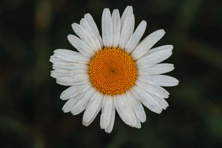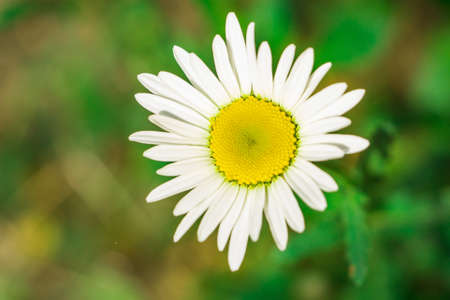 Cute romantic flower of daisy with vivid yellow pollen and long white petals close up. Picturesque leucanthemum vulgare in macro. Pleasant camomile on green background with copy space on greenery.