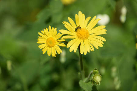 Pretty profile of a yellow leopards bane flower blooming and flowering.