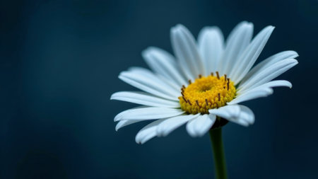 a white daisy with a yellow center on a dark blue background The flower has a stem and the background is slightly blurred, giving the image a dreamy feel.