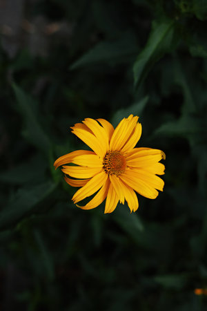 Colorful juicy yellow flower with orange center and vivid pleasant pure petals. Flowering jerusalem artichoke in macro. Blossoming helianthus tuberosus close-up. Beautiful flower of topinambur.