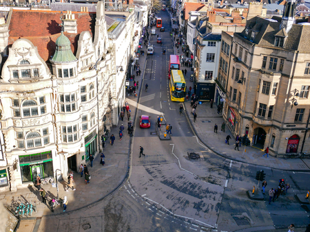 Oxford, UK - August 29, 2019: High angle view of High Street of Oxford, United Kingdom.