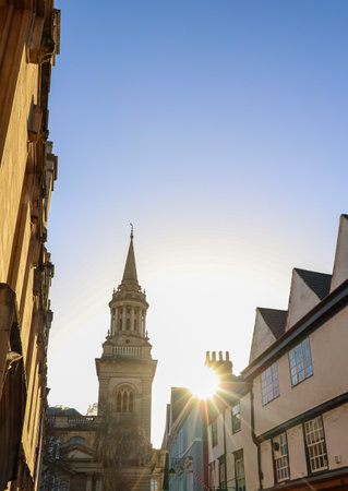 Oxford city architecture creating a historical cityscape with a spire reaching towards the clear blue sky and sun flare