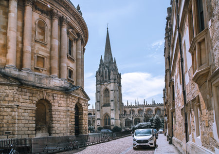 The impressive gothic architecture of the University Church of St. Mary the Virgin in Oxford, England.