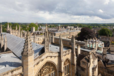 Aerial view of the All Souls College and Oxford cityscape from the top of University Church of St Mary the Virgin at United Kingdom