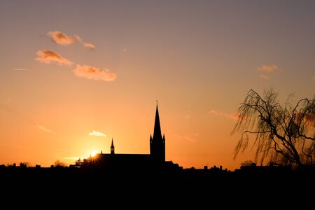 Church building exterior in silhouette of sunrise or sunset with glowing sunlight