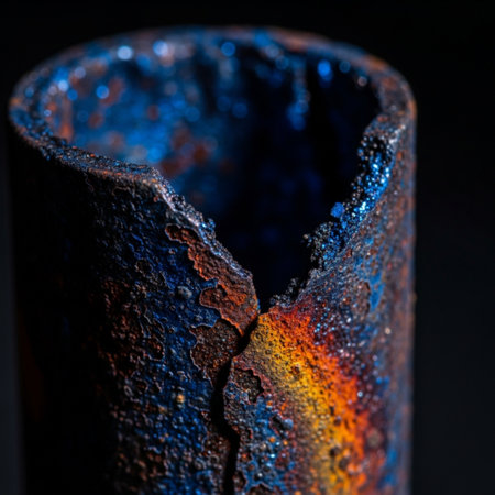 Close-up view of a weathered and rusty pipe fitting, revealing the intricate textures and colors formed over time in a derelict industrial setting, whispering stories of past operations.