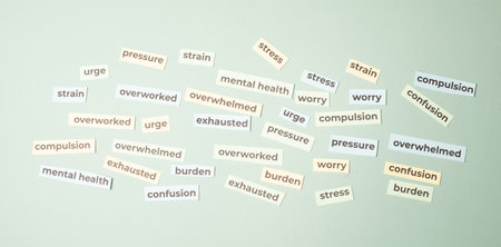 Anxiety Stress Fear and Burnout words on torn pages next to trash bin, concept of overcoming your obstacles and mental health support