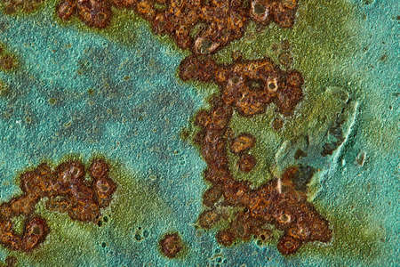 Close up of a rusted metal surface with a teal patina and textured corrosion. Clear details and vibrant colors...