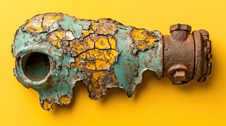 A closeup of a rusty old pipe featuring vibrant peeling paint against a striking yellow background, showcasing distinct textures and decay patterns.