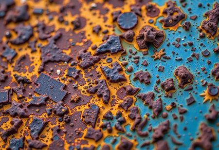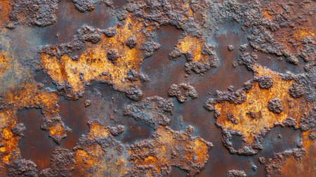 This close-up showcases a metal surface with significant wear and tear. The color palette features a mix of rusty oranges, yellows, and browns. The textured composition reveals the effects of time and environment. This image is suitable for various commercial uses, including website backgrounds and design elements.
