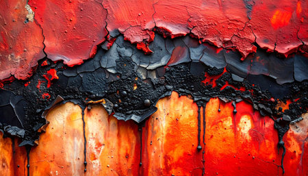 A macro view captures the intense aftermath of a fire, where layers of red paint peel and curl away from a charred and corroded metal surface.