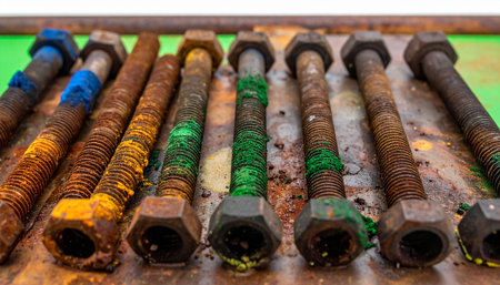 A lineup of heavy-duty industrial bolts and nuts tells a story of time and endurance. Each piece, marked by layers of rust, corrosion, and faded paint, showcases a history of hard work and exposure to the elements, symbolizing strength, decay, and the beauty of imperfection.