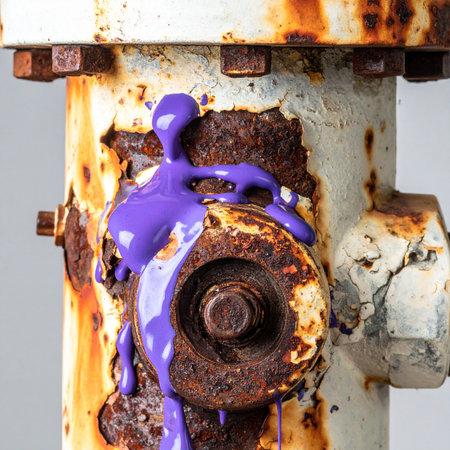 A splash of vibrant purple paint brings an unexpected burst of life to a heavily corroded industrial pipe. The thick liquid drips over the rusted bolts and peeling white paint, creating a striking abstract visual that highlights the contrast between decay and renewal, industry and art.