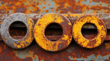 This image captures a detailed close-up of a weathered metal surface featuring rusted fasteners and traces of yellow paint, showcasing industrial decay.