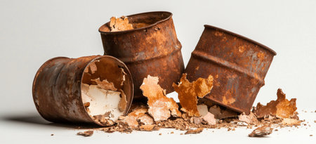 Abandoned rusted oil drums with flaking metal on a white background.