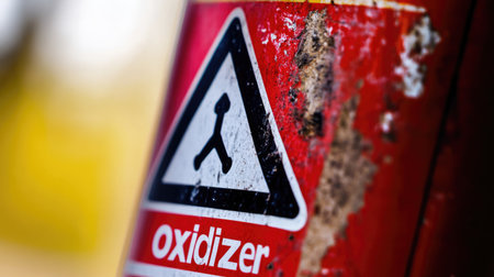 This close-up photo depicts a red hazardous material container featuring an oxidizer warning sign, emphasizing safety in industrial environments with potential risk.