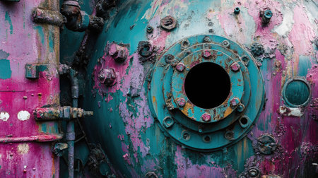 Close-up view of a weathered industrial vessel showcasing vibrant colors and peeling paint. The fascinating textures highlight decay and history.