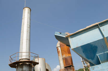 Rustic factory equipment standing tall against a clear blue sky, representing the power of industry and manufacturing. Generative ai.