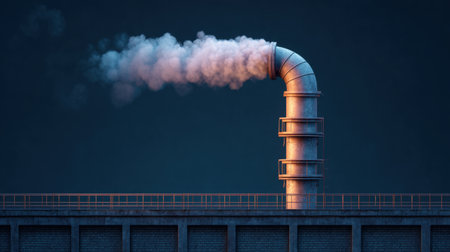 A striking industrial smokestack releases a plume of smoke into the dusk sky, creating a dramatic scene with illuminated pipes against a dark urban backdrop.